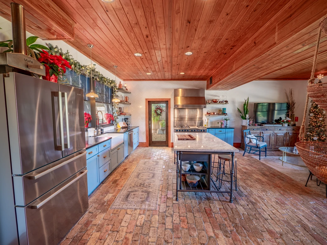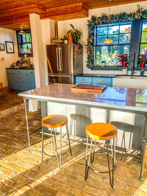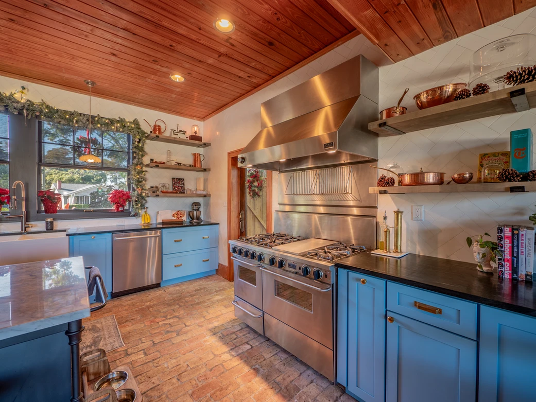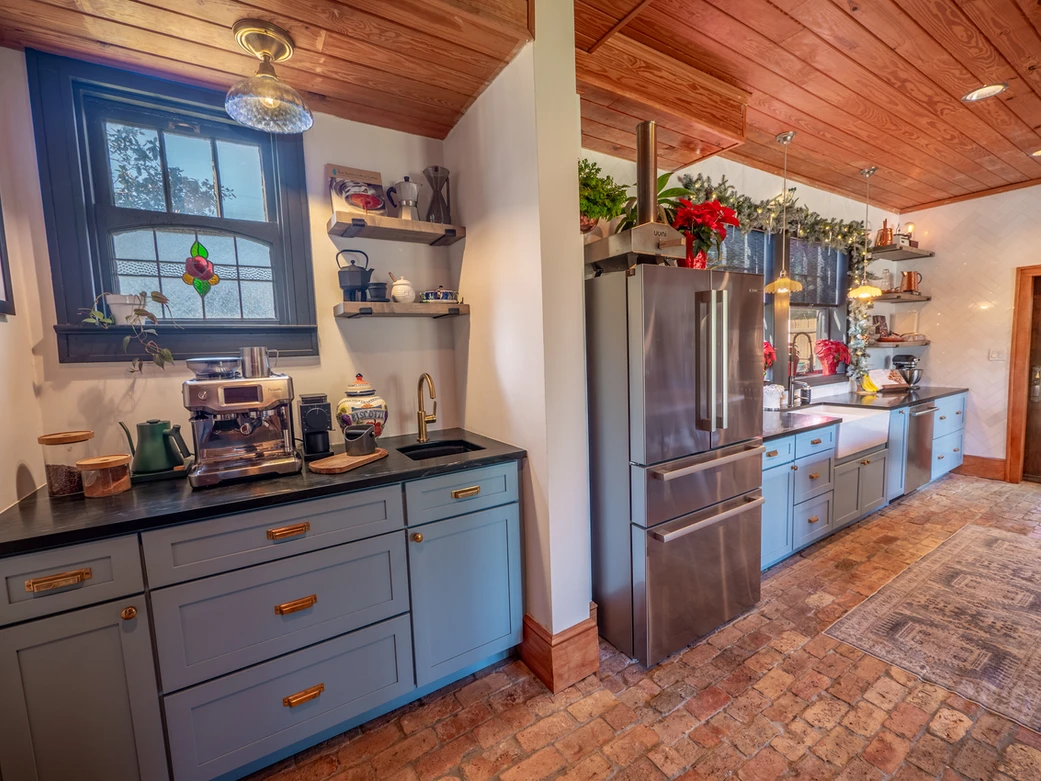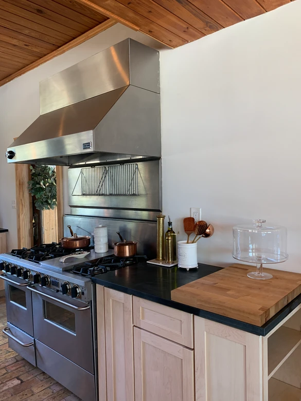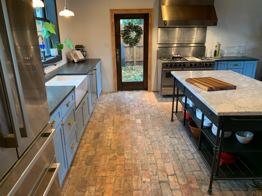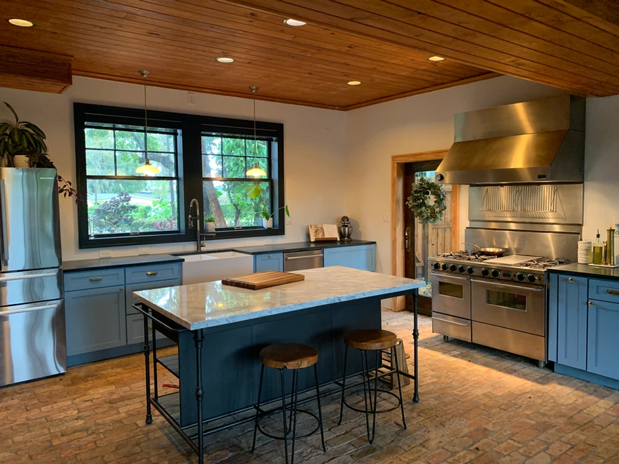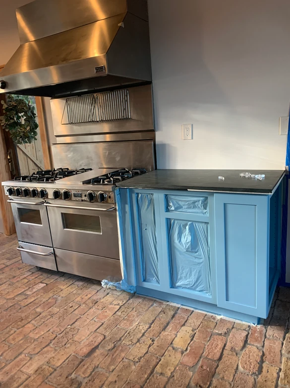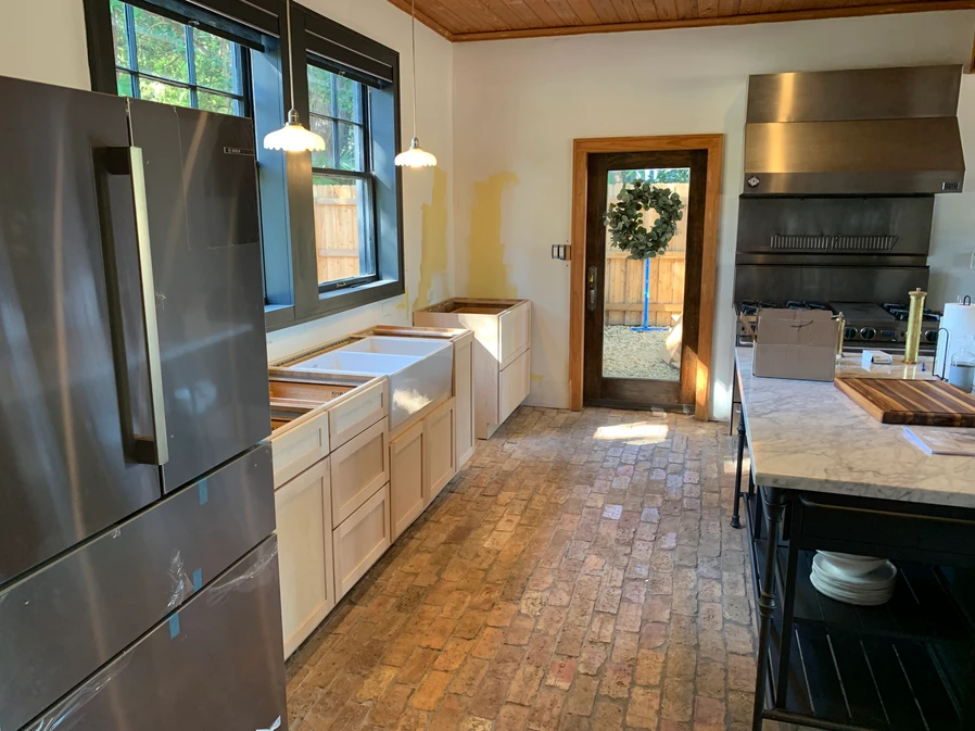 There are only 2 things we're keeping in this "Kitchen," and that's the FiveStar 46" range and commercial hood. The imported Chicago brick floors will be staying as well. The kitchen is basically unusable. The sink is impossible to clean, the fridge is on its last legs, and the cabinets are useless. The layout of the kitchen also makes it difficult to maneuver.