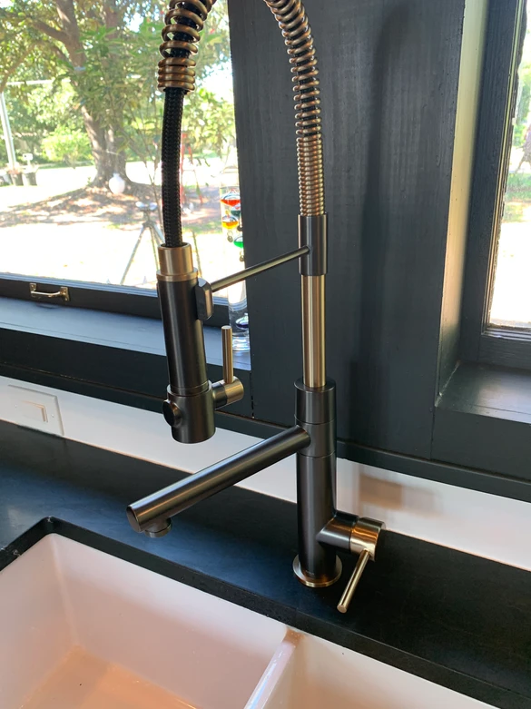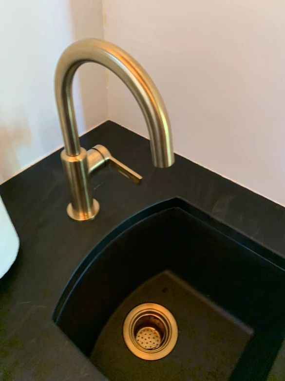 Next up is to install the bar sink, faucets and dishwasher. We went with a dark great granite and resin bar sink. We wanted it do just disappear in the countertop. We chose a mix of gold and black fixtures and a matching Bosch Dishwasher.