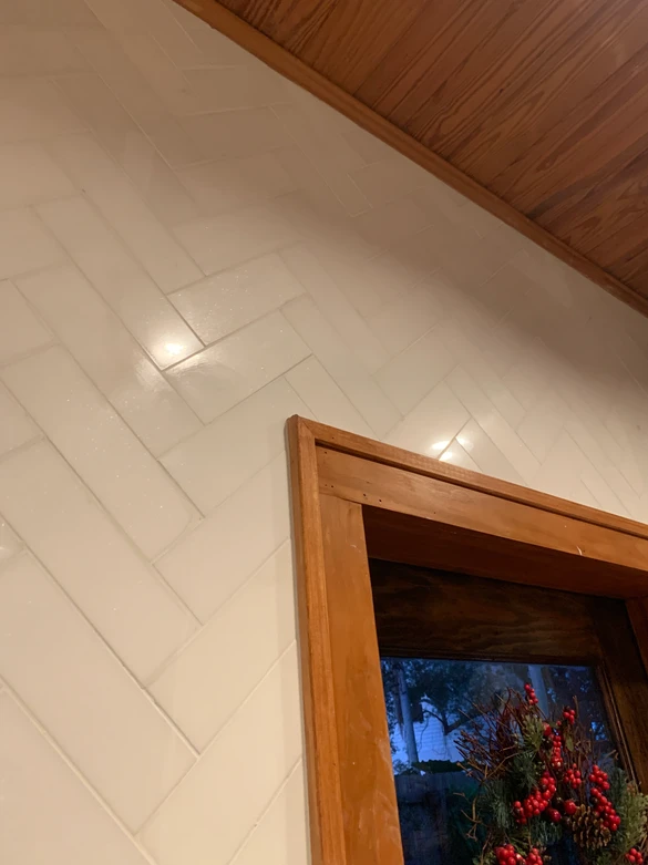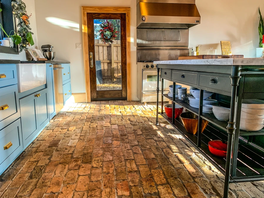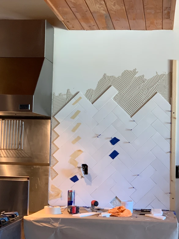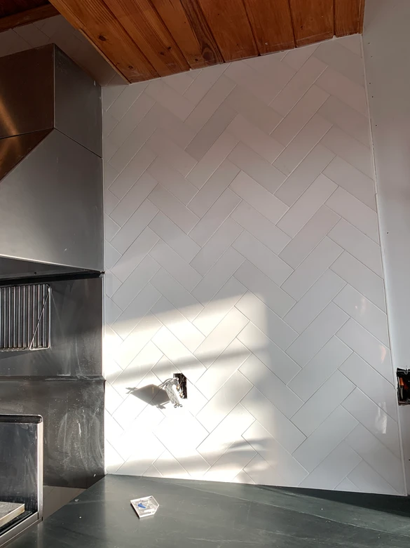 To help separate the kitchen from our version of a keeping room, we're adding these marble tiles in a herring bone pattern.