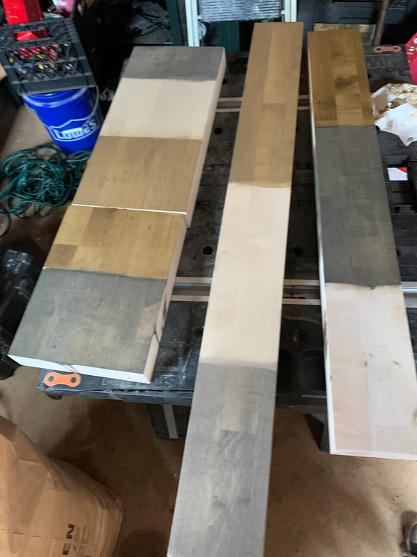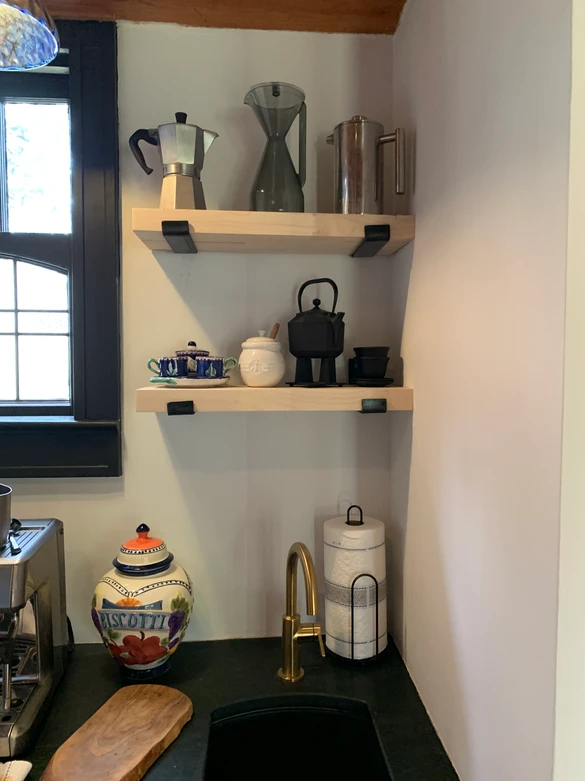 Once the tile has set up and grouted we added maple butcherblock shelves with custom iron brackets.