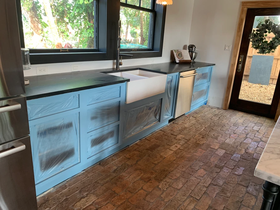 Next up is painting the cabinets. Everything needs to be taped off and the cabinet doors and drawers need to be removed. The color is Sherwin Williams Resolute Blue. We think this color is going to look great in our French Country inspired kitchen.