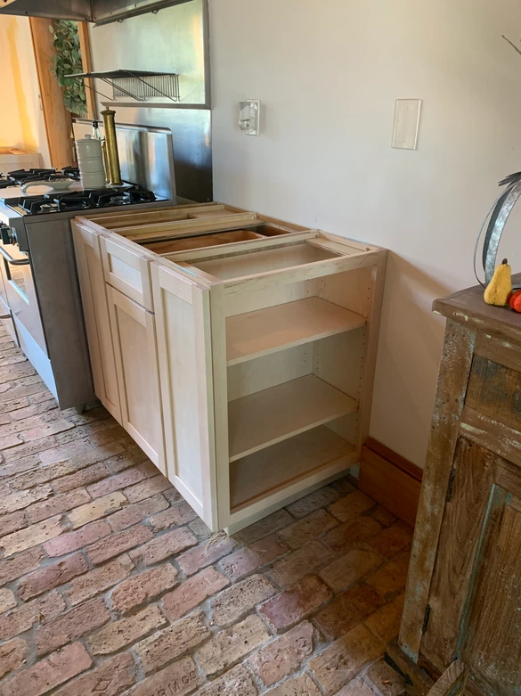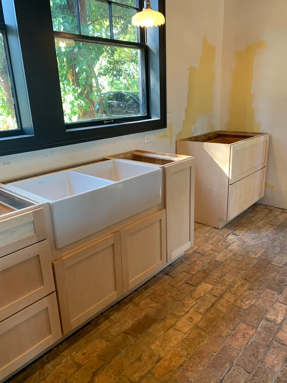 The cabinets are now in place and the apron sink is set. That sink is very heavy. It is braced under the cabinet. Now we wait for the countertops.