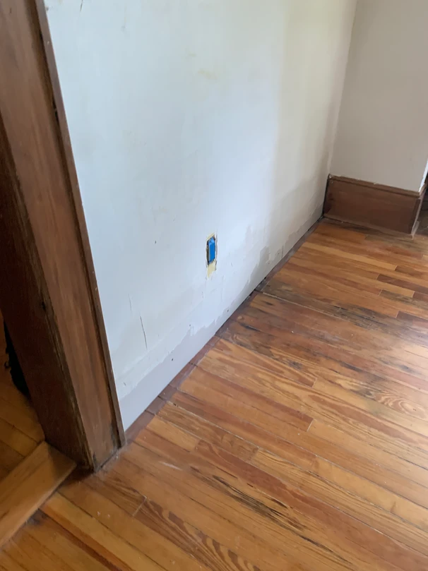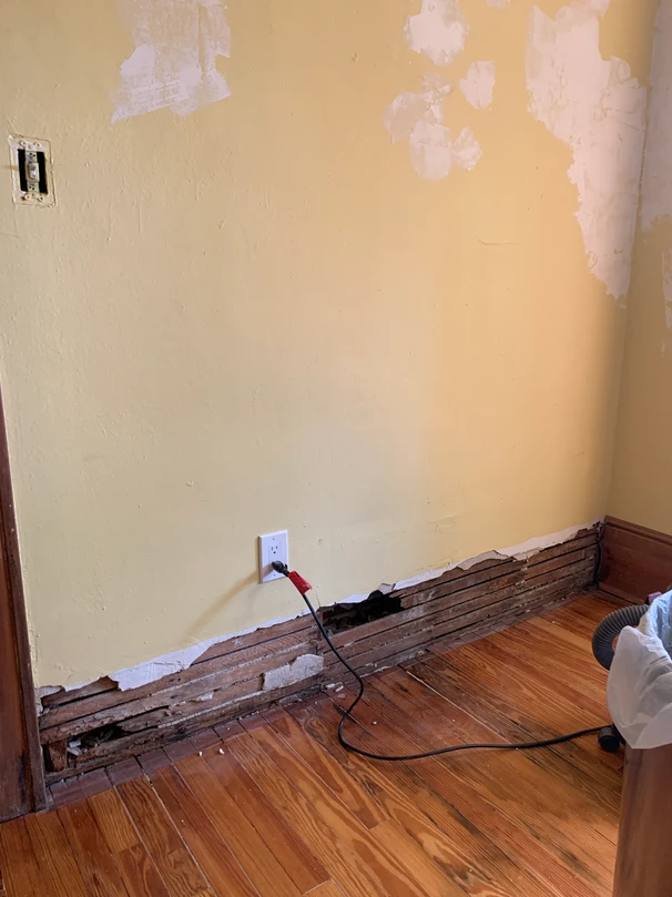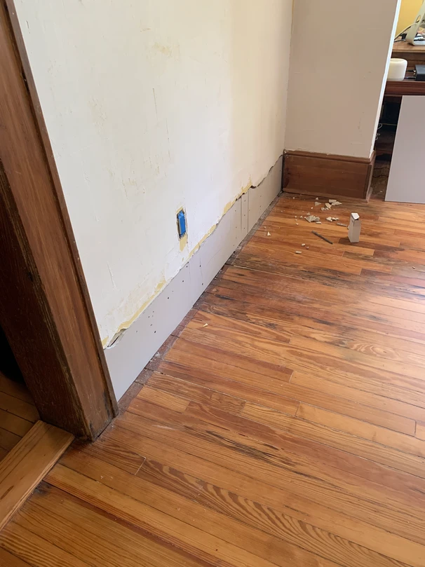 A large amount of the original plaster is disintegrating at the baseboards, possibly due to the installation of baseboards with carpenter nails and a hammer. This, coupled with neglect, led to the shattering of all the plaster.