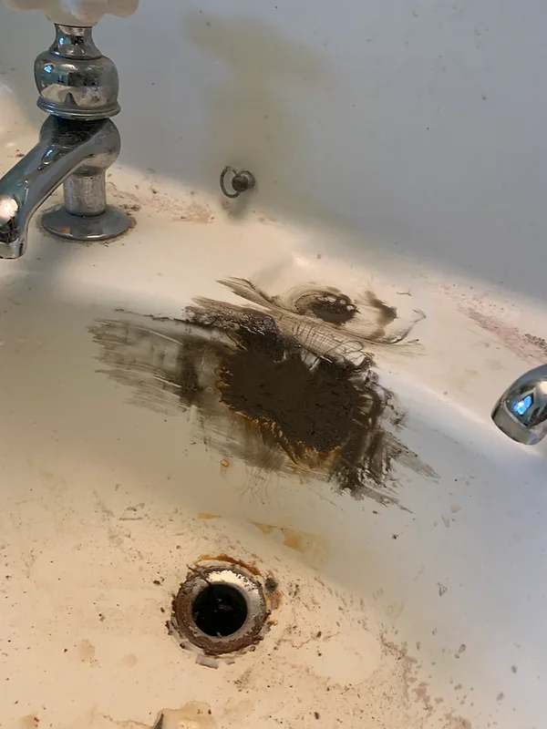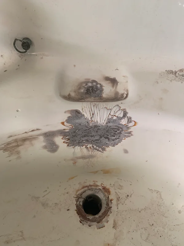 I think I can salvage the sink, but we're going to have to lose the overflow. It's pretty rusted out. The first step was to clean and remove any loose rust. I also used a rust dissolver and scrubbed the rust spots as best I could. Then I sealed the rust with a rust sealer.