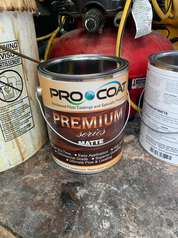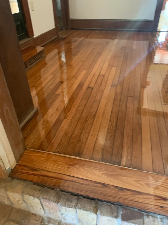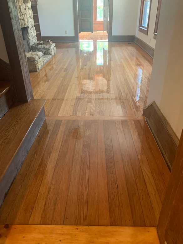 This is the floor right after the second coat of polyurethane was applied. It's still wet which is why it's so shiny. The poly is rolled on thick with a roller and then it's buffed and vacuumed between each clear coat.