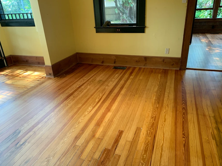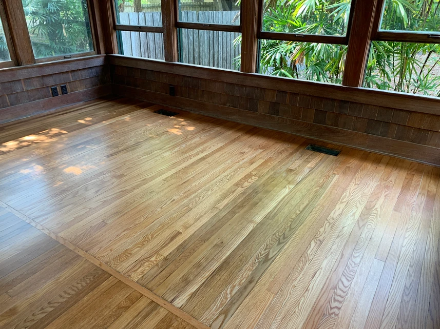 There are 2 species of wood floors in this house: red & white oak blend and Dade County Pine.